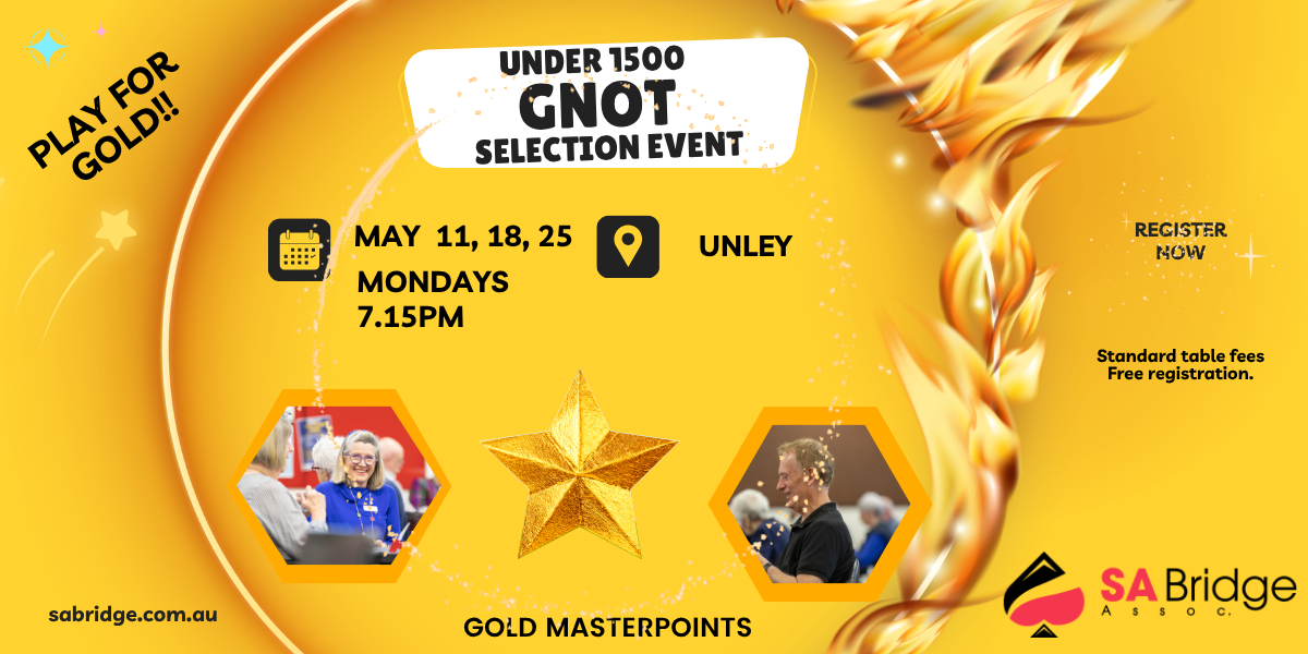 SABA GNOT teams’ selection event will be held at Unley on Monday nights at 7.15pm on May 11, 18 & 25th. This teams event is for 4, 5 or 6 players, and Gold Masterpoints will be awarded.